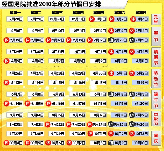 當(dāng)前位置:首頁 > 網(wǎng)站舊欄目 > 學(xué)習(xí)園地 > 娛樂新聞 > 2010年中秋國慶假期時(shí)間安排 一個(gè)月分8斷(圖)