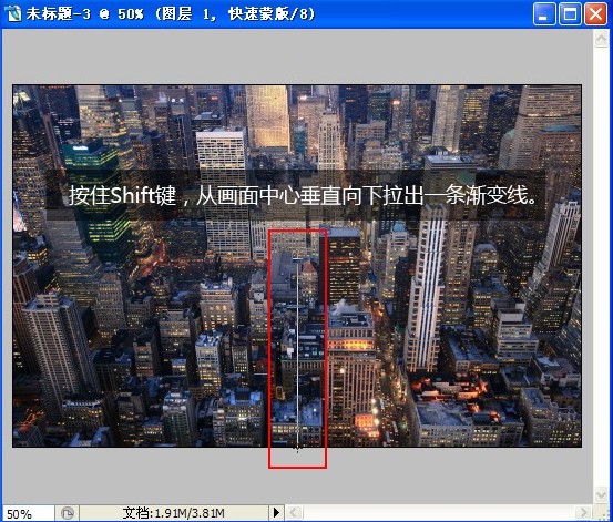 4.按住Shift鍵,從畫面中心垂直向下拉出一條漸變線。