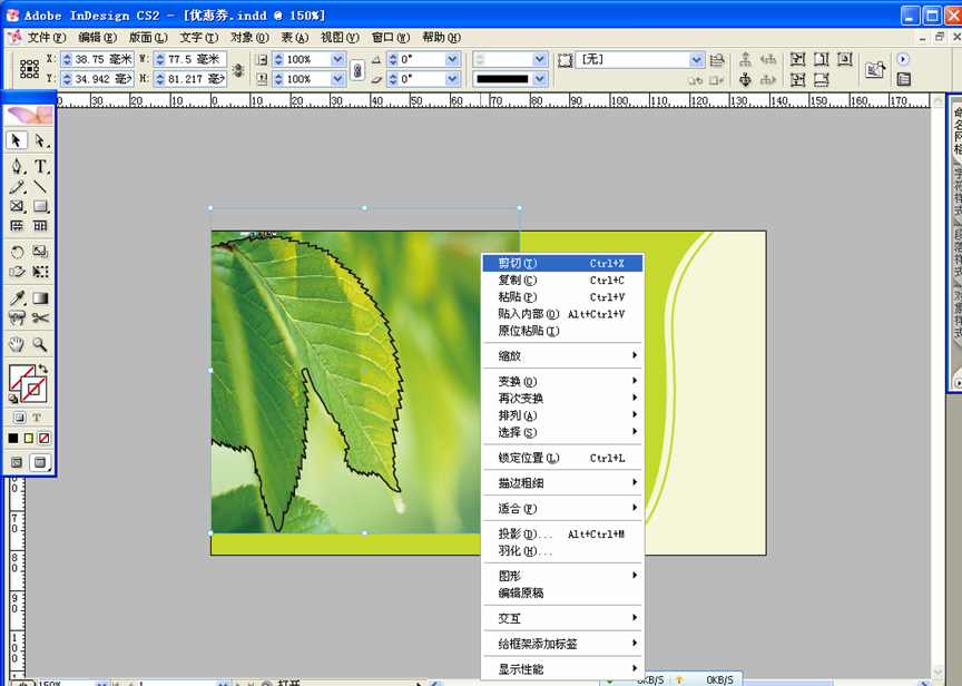 4、導入圖片:使用文件——置入(Ctrl+D)命令,將圖片置入到文檔中,使用鋼筆工具沿著所需內容邊緣繪制一條閉合路徑,使用選擇工具將圖片選中,將其剪切,然后再選中剛繪制的路徑,右鍵單擊,在彈開菜單里選“貼入內部”命令,再將輪廓色設置為無,如下圖所示:
