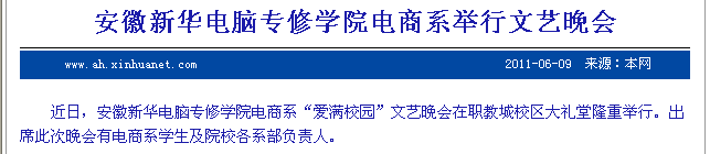新華網(wǎng)訊 近日,安徽新華電腦專(zhuān)修學(xué)院電商系“愛(ài)滿校園”文藝晚會(huì)在職教城校區(qū)大禮堂隆重舉行。出席此次晚會(huì)有電商系學(xué)生及院校各系部負(fù)責(zé)人。
