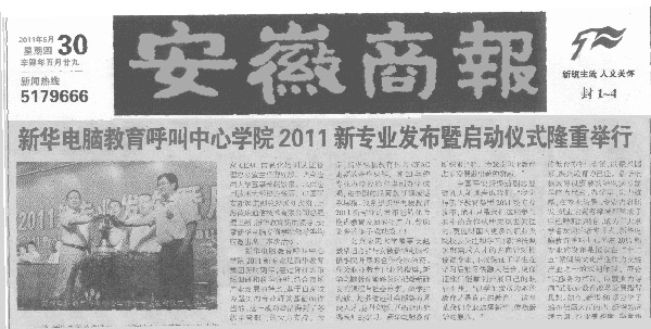 《安徽商報》報道:新華電腦教育呼叫中心學院2011新專業發布暨啟動儀式隆重舉行