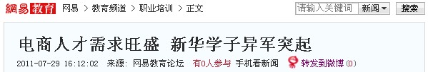 據(jù)了解,近年來,電子商務(wù)行業(yè)招聘需求很旺,一些用人單位搶先與新華建立長期的人才合作關(guān)系,試圖通過該途徑找到電子商務(wù)專業(yè)出身的優(yōu)秀人才,并以高薪和股權(quán),以期組成一支專業(yè)、成熟的人才隊伍。