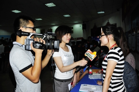 參加應(yīng)聘的學生接受合肥電視臺記者的采訪