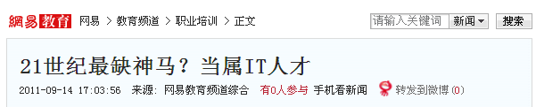 網易教育訊:21世紀是信息的時代 ,IT應用觸及社會每一個角落。 金融 、電信、 電子商務、歐美及對日軟件外包等行業和領域的迅猛發展 ,毋庸置疑會帶來專業軟件開發人才需求數量的大幅增長。同時隨著我國互聯網行業的全面復蘇以及網絡應用在更高層次上的大規模展開,我國的網絡人才需求也在全新的層面上逐步呈現了出來。