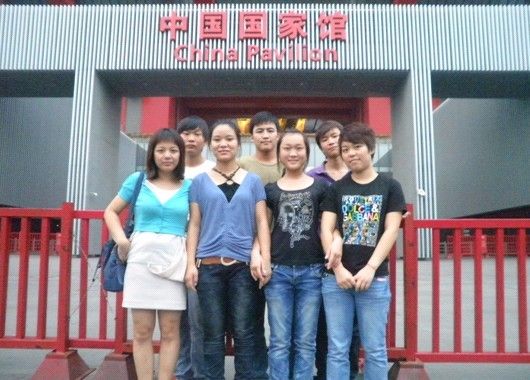 工作在中聯公司的新華學子與老師在世博館外合影留念