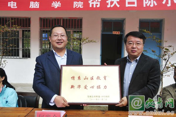 安徽電視臺公共頻道向安徽新華電腦專修學院授助學紀念牌袁勝總監表達了對安徽新華電腦專修學院熱心社會公益事業的誠摯感謝,他說:“在‘走基層、轉作風、改文風’活動前期的調查走訪中發現了山區教育存在的困難,此新聞一經播出后,就獲得了安徽新華電腦專修學院的大力支持,他們積極地為山區學校捐贈了電腦、書架、電腦桌椅、電子琴、數碼相機等物資,并進行音樂課和計算機課支教工作,不僅解決了學校的教學設施設備問題,同時也豐富了學生們的課外生活。”