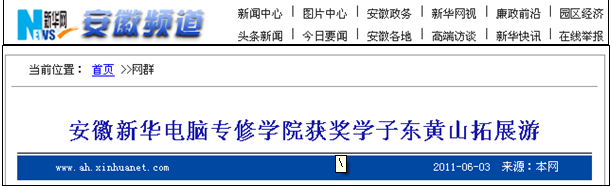 新華網(wǎng)訊:5月28日-29日,安徽新華電腦專修學(xué)院為期兩天一夜的東黃山拓展游活動(dòng)圓滿結(jié)束。據(jù)悉,此次東黃山拓展游,是由美國(guó)CIW獨(dú)家贊助,為激勵(lì)該學(xué)院14名學(xué)子在第七屆校園數(shù)字文化節(jié)競(jìng)賽獲得一等獎(jiǎng)專門設(shè)立的一個(gè)獎(jiǎng)項(xiàng)。