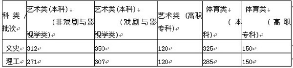 安徽省2014年普通高校招生藝、體類文化課最低控制分數(shù)線一覽表