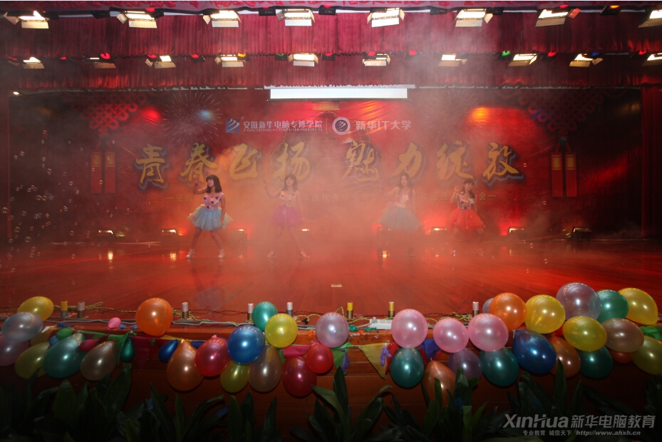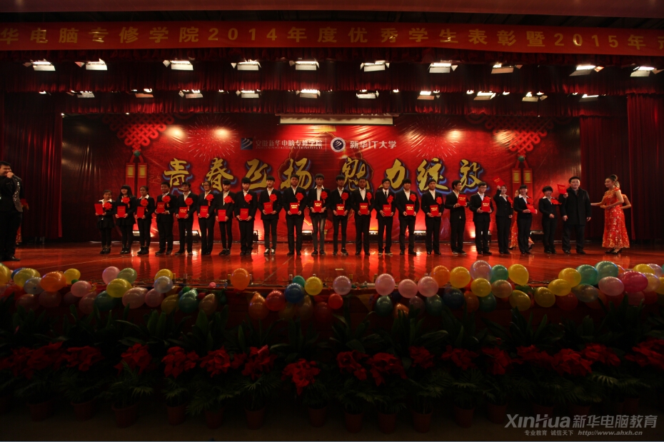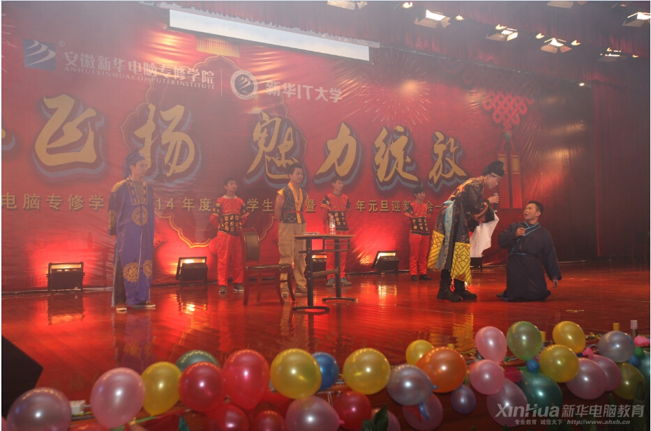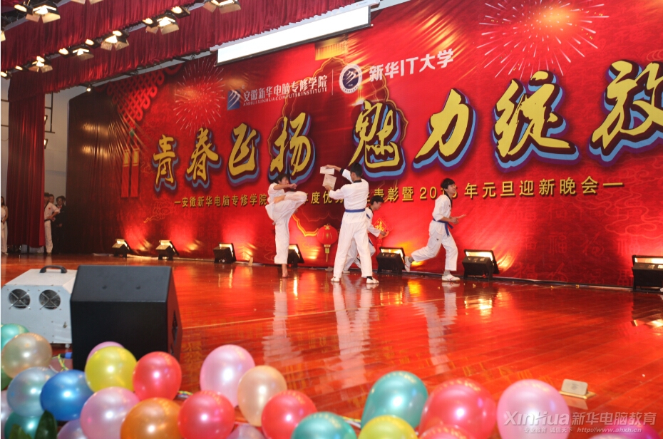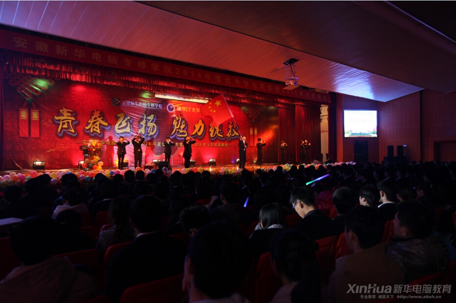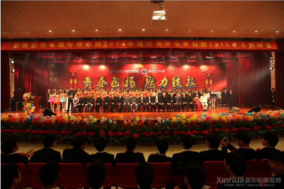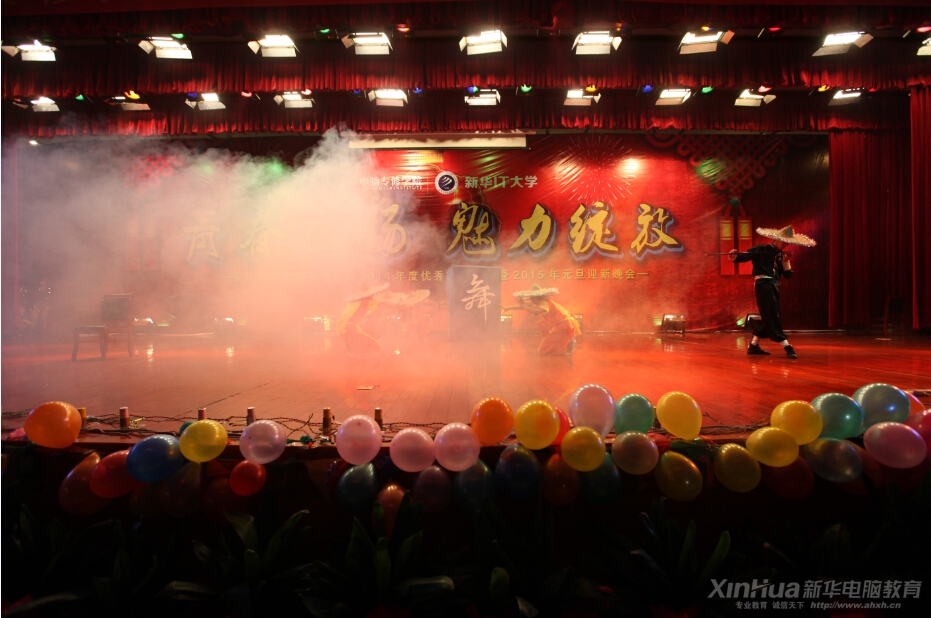 安徽新華電腦專修學院“2014年度優(yōu)秀學生表彰暨2015年元旦迎新晚會”在學院大禮堂圓滿舉行。晚會節(jié)目形式多樣、內(nèi)容豐富,包括歌曲、舞蹈、小品、朗誦、武術等節(jié)目。現(xiàn)場氣氛熱烈,臺下座無虛席,掌聲雷動。