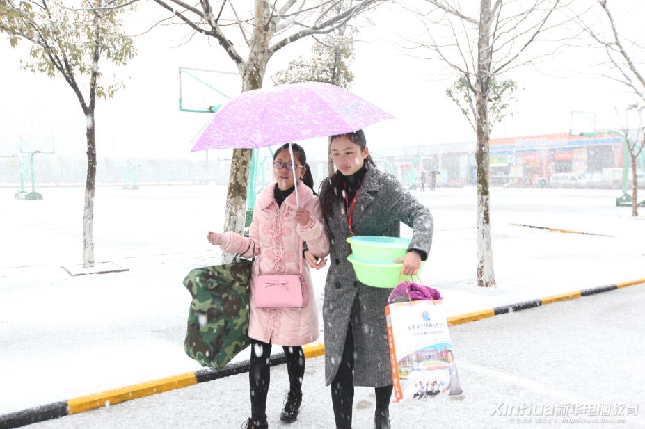 為方便學子報名,安徽新華電腦專修學院全天候開通接站車輛,為保證隨時出動,后勤老師冒雪在車旁等候