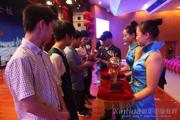 安徽新華電腦專修學(xué)院學(xué)生處主任和企業(yè)代表為冠軍社團(tuán)頒獎