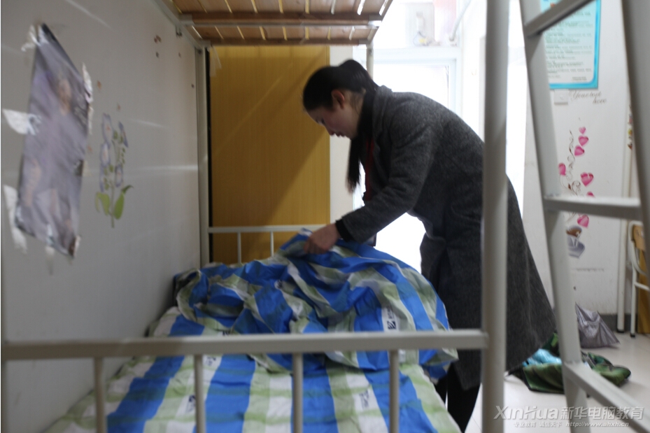 班主任老師為她的學(xué)生領(lǐng)好物資,細(xì)心的鋪起床鋪,整理著每一個(gè)物品