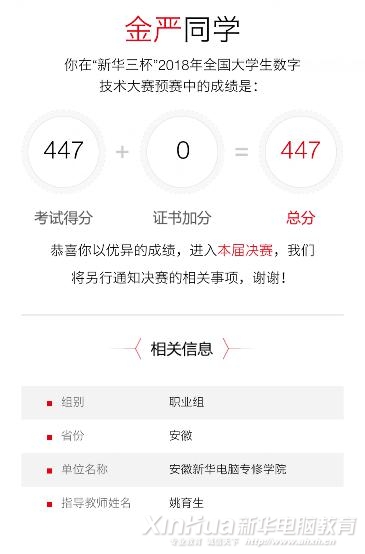 安徽新華電腦專修學院連續多年參與新華三全國大學生數字技術大賽,并成績斐然。今年我院網絡工程專業學生侯月陽以618分的成績成功晉級2018年H3C本科組總決賽,金嚴同學以477分的好成績成功晉級2018年H3C職業組總決賽。