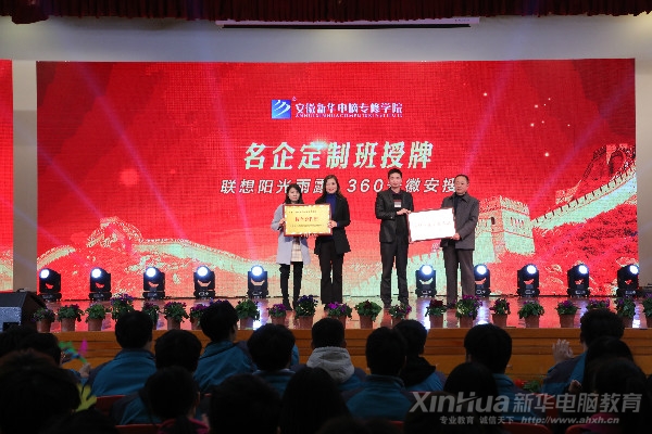 為積極響應國家關于加強校企合作的號召,充分發揮學校與企業的雙方優勢,發揮職業技能教育為社會和企業培養高素質、高技能應用型人才的作用。我院積極與各優秀企業合作,共同成立名企定制班,幫助學子精準就業,幫助企業吸納人才,實現校企雙贏。晚會現場,聯想陽光雨露、360安徽安搜等名企蒞臨,與安徽新華共同揭牌《名企定制班》。