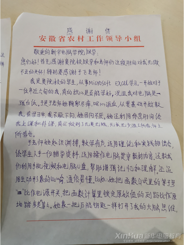 2019年12月3日,安徽新華電腦專修學院的于飛老師收到了一封特殊的信。整封信字跡工整、筆筆動情,是于飛老師的學生吳先環(huán)所寫。