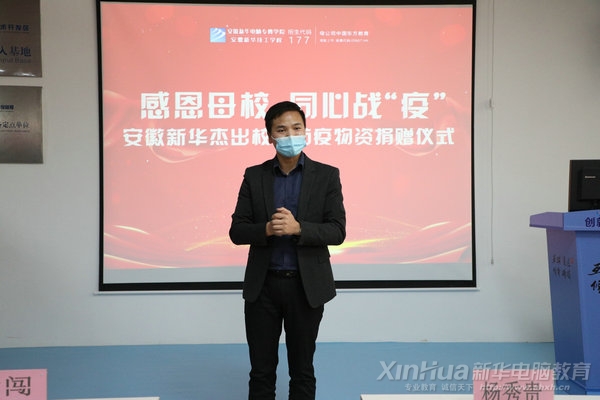 黃闖畢業于我院電子商務專業,目前是安徽一美科技有限公司總經理。談及本次向母校捐贈防疫物資,他說:做企業首先是一種責任一份擔當,在非常時期能為社會、為母校做出一些貢獻,是我們的光榮,同心戰“疫”,我們還在路上。