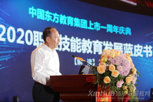 為更好地推進職業教育發展,發布儀式現場,在全場矚目下,國務院參事室特約研究員、中國勞動學會會長、人力資源和社會保障部原黨委副書記、常務副部長楊志明,安徽省人力資源和社會保障廳副廳長劉少華,中國東方教育集團董事會主席吳偉,中國職業技術教育學會副會長陳李翔,中國民辦教育協會職業教育專業委員會理事長藺琪,安徽省人力資源和社會保障廳職業能力建設處處長劉曉燕,中國東方教育集團總裁許紹兵,合肥新站高新技術產業開發區黨工委委員、管委會副主任劉婷,合肥市人力資源和社會保障局副局長方強共同啟動發布了《2020職業技能教育發展藍皮書》(以下簡稱《藍皮書》)。