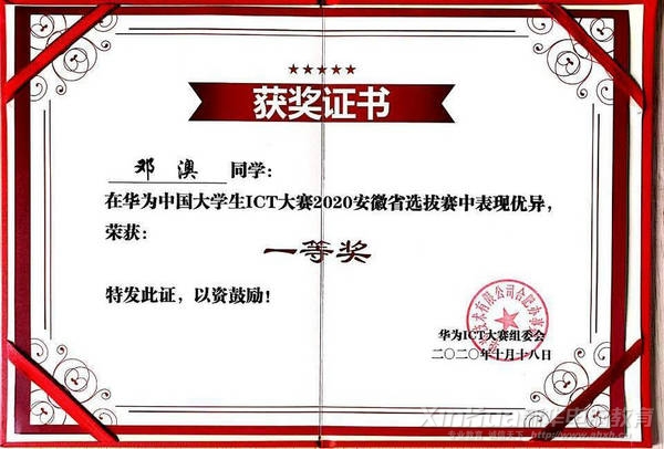 我院學子鄧奧在華為中國大學生ICT大賽2020安徽省選拔賽中榮獲一等獎