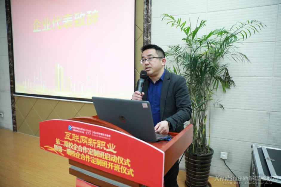 隨后,安徽今日互聯科技有限公司常務副總經理發表講話,他表示新華·今日互聯“3.0”人才培養計劃,將是一次與安徽新華深度合作的最佳見證,并表示將為定制班學子提供切實可行的項目拓展實踐,助力學子成為互聯網優秀人才。