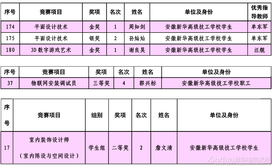 2月6日,安徽省人力資源與社會保障廳官網發布《關于公布第九屆全省職業技能大賽等2022年四項省級職業技能競賽獲獎名單的通知》,安徽新華高級技工學校位列榜單喜提佳績,共斬獲金獎2項、銀獎2項、銅獎1項。