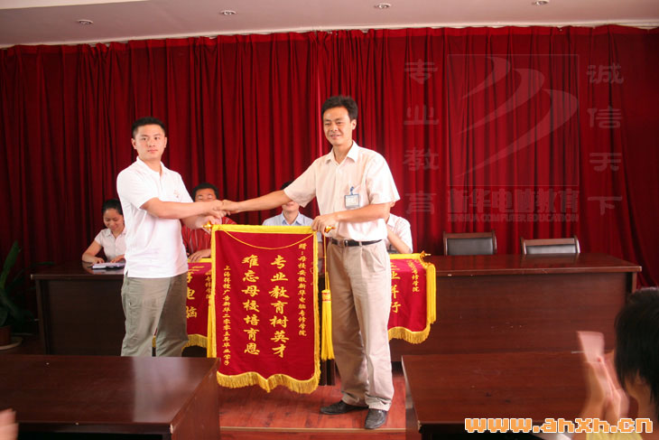 贈旗儀式在西區第一會議室隆重舉行,上海得搜廣告公司經理韓璐、安徽新華電腦專修學院副院長束開俊、院就業辦主任鄭成鯤、院西區主任張榮福以及老師代表和部分在校學子參加了儀式。