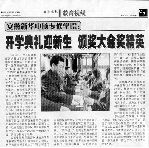 3月20日,《合肥晚報(bào)》教育視線版報(bào)道“安徽新華電腦專修學(xué)院:開學(xué)典禮迎新生 頒獎(jiǎng)大會(huì)獎(jiǎng)精英”的新聞并做了詳細(xì)報(bào)道,敬請(qǐng)關(guān)注!