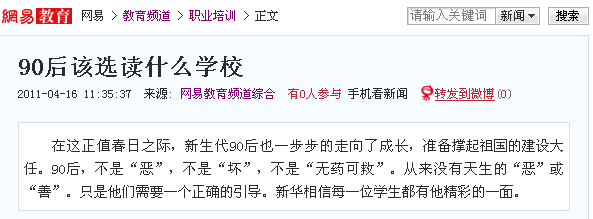 “現(xiàn)在的90后學生確實不同于往年的學生,很淘、很鬧、也很不服管教。倘若依然延續(xù)之前的教育管理方式,那一定會讓老師們吃不少苦頭的。”說這話的是山西新華電腦學校一位有著多年帶班經(jīng)驗的班主任老師。說道“苦頭”王老師笑了笑。想來,也許他也是從苦頭中走過來的吧!“但其實90后的孩子,很可愛也很懂事。他們用他們獨特的方式在表達著自我,在實踐著夢想。”一位90后的博客中看到這樣的一段話“有人說:‘和尚穿耐克,手機玩蘋果。連養(yǎng)條狗都是他媽世界名犬。像是哥化的不是緣,化的是他媽耐不住寂寞的生活方式。’的確,我不得不承認我們90后幾乎所有孩子都很早熟,而且所有不該在我們身上出現(xiàn)的問題都層出不窮。打架,早戀,吸煙喝酒,都是我們的問題。而學習,競賽都沒有我們的歷史。沒錯,我們不想活在壓抑的世界,不想成為所謂的“神童”。我們不想在長大之后成為一些“人面獸心”的人,我們只是很單純的希望有一個自由的空間去發(fā)展我們喜愛的東西。打架,正是我們兄弟情誼的體現(xiàn),但卻被大人們嗤之以鼻;早戀,只是我們情感的寄托,但卻被大人批評得如此不堪;吸煙喝酒,是出于人類模仿的本性和精神的依托。”