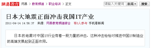日本的地震對中國IT行業有著一股力量的沖擊,這種沖擊恰恰對推進中國IT制造業的高端發展起到正面作用。高端領域的產品第一要求就是有最先進的設計方法,IT制造業的發展契機無疑也是IT信息技術產業的發展保障且IT產業發展的越高端,IT信息技術將越普及,對IT高端人才的需求也將越饑渴。