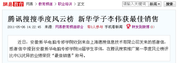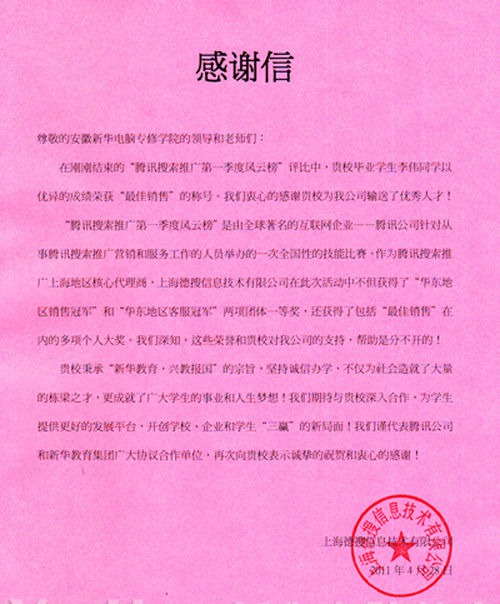安徽新華電腦專修學院08屆學生李偉,在騰訊搜索推廣第一季度風云榜評比中以優異的業績榮獲“最佳銷售”稱號,發來感謝信以表達對新華為他們輸送優秀人才的感激之情。