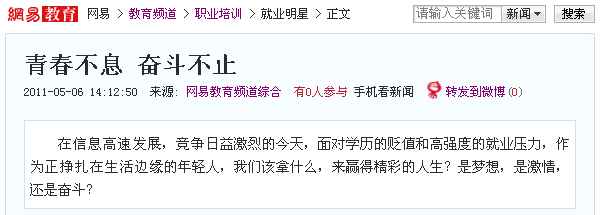 網易教育頻道訊 在信息高速發展,競爭日益激烈的今天,面對學歷的貶值和高強度的就業壓力,作為正掙扎在生活邊緣的年輕人,我們該拿什么,來贏得精彩的人生?是夢想,是激情,還是奮斗?