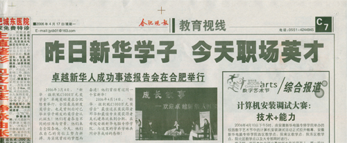 4月17日,《合肥晚報(bào)》教育視線版報(bào)道了“昨日新華學(xué)子 今天職場英才”的新聞,并做了詳細(xì)報(bào)道,敬請關(guān)注!