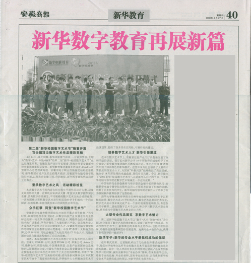 在本次數(shù)字藝術(shù)節(jié)上,安徽省信息產(chǎn)業(yè)廳廳長賀凌發(fā)表了熱情洋溢的講話。賀廳長對新華辦學(xué)18年所取得的成績給予了充分肯定:“新華教育集團(tuán)胸懷興教報(bào)國之志,率先在中國IT教育界開創(chuàng)了獨(dú)具特色的新華模式。這些年來為社會(huì)培養(yǎng)了大量的計(jì)算機(jī)應(yīng)用型復(fù)合人才,為國家“科教興國”戰(zhàn)略做出了突出貢獻(xiàn),她辦學(xué)18年所取得了卓越成績,我們有目共睹。今天,新華推出了“2006新華·校園數(shù)字藝術(shù)節(jié)”,這是新華人自己的節(jié)日,代表新華電腦專修學(xué)院在數(shù)字藝術(shù)領(lǐng)域進(jìn)一步走向成熟。”