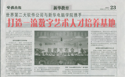 安徽新華電腦專修學院院長沙旭在新聞發布會上表示:作為華東地區惟一與中國美術學院一起獲得“Adobe數字藝術中心”稱號的電腦教育機構,新華在Adobe數字藝術設計教育方面有著突出貢獻和強大的實力。“Adobe數字藝術中心”是Adobe公司為了協助高等院校更好、更快的建立自己的數字藝術教育體系而推出的授權項目,以協助學校在數字藝術教育朝向高層面的方向發展。Adobe數字藝術中心培養的學生,必須要達到Adobe合格學生的標準,對學生的就業有著非常大的助益。