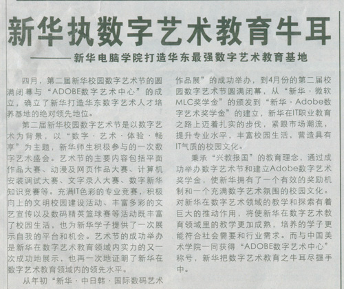 從年初“新華·中日韓·國際數碼藝術作品展”的成功舉辦到4月份的第二屆校園數字藝術節圓滿閉幕,從“新華·微軟MLC獎學金”的頒發到“新華·Adobe數字藝術獎學金”的建立,新華在IT職業教育之路上邁著扎實的步伐,緊跟市場潮流,努力進取,提升專業水平,豐富校園生活,營造具有IT氣質的校園文化。