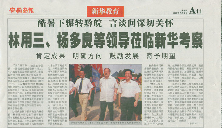 7月6日,《安徽商報》報道:“林用三、楊多良等領導蒞臨新華考察”的新聞,敬請關注!