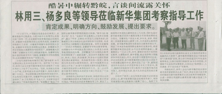 7月4日,《安徽商報(bào)》報(bào)道:“林用三、楊多良等領(lǐng)導(dǎo)蒞臨新華集團(tuán)考察指導(dǎo)工作”的新聞,敬請關(guān)注!