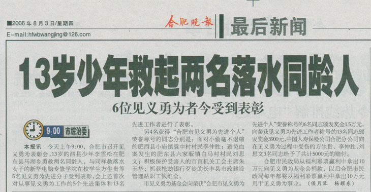 8月3日,《合肥晚報(bào)》最后新聞報(bào)道:“13歲少年救起兩名落水同齡人”, 敬請(qǐng)關(guān)注!