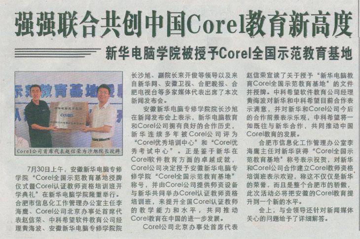 安徽新華電腦專修學(xué)院院長沙旭在新聞發(fā)布會上表示,新華電腦教育和Corel公司擁有良好的合作歷史,新華連續(xù)多年被Corel公司評為“Corel優(yōu)秀培訓(xùn)中心”和“Corel優(yōu)秀考試中心”。正是鑒于新華在Corel軟件教育方面的卓越成就,Corel公司決定授予安徽新華電腦專修學(xué)院“Corel全國示范教育基地”稱號,并由Corel公司提供師資設(shè)備與新華共同舉辦Corel認(rèn)證教師資格培訓(xùn)班,來提升全國Corel認(rèn)證教師的教學(xué)能力和水平,共同推動Corel教育在中國的進(jìn)一步發(fā)展。