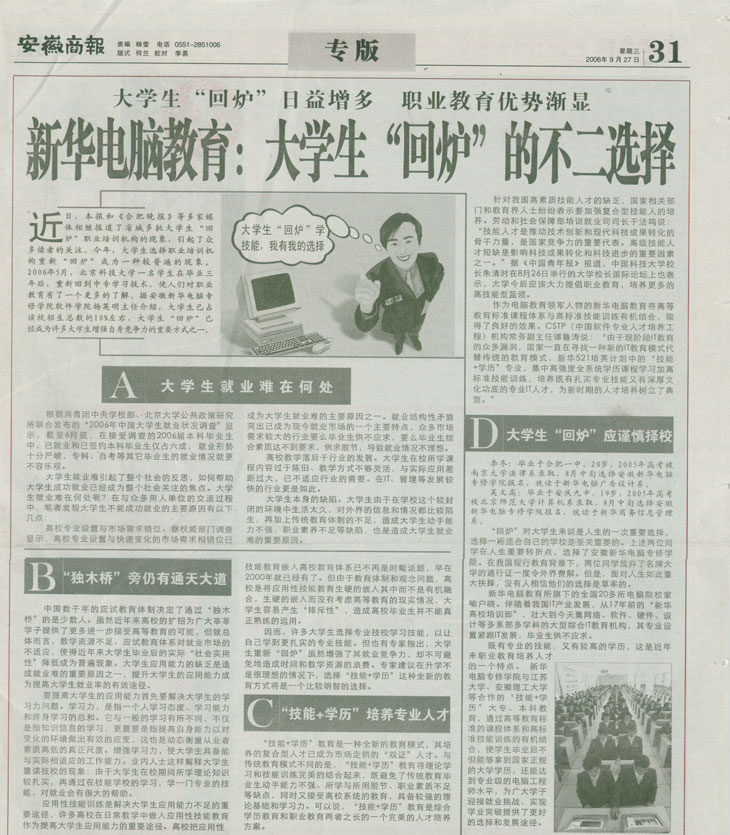 9月27日,《安徽商報》報道:“新華電腦教育:大學生“回爐”的不二選擇”的新聞,敬請關注!