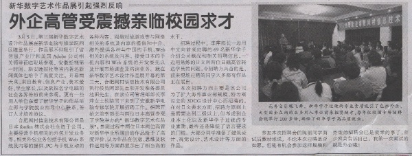 3月9日,《安徽商報(bào)》報(bào)道:“新華數(shù)字藝術(shù)作品展引起強(qiáng)烈反響—外企高管受震撼親臨校園求才”,敬請關(guān)注!