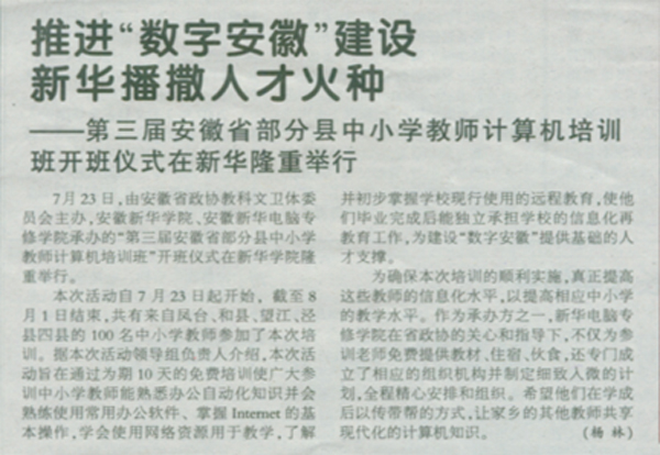 7月25日,《安徽商報》報道:“推進(jìn)“數(shù)字安徽”建設(shè) 新華播撒人才火種——第三屆安徽省部分縣中小學(xué)教師計算機(jī)培訓(xùn)班開班儀式在新華隆重舉行 ”,敬請關(guān)注!
