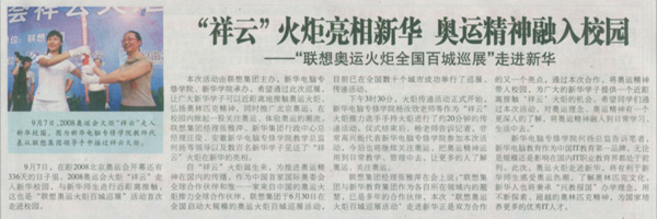9月10日,《合肥晚報》報道:“‘祥云’火炬亮相新華 奧運精神融入校園——‘聯想奧運火炬全國百城巡展’走進新華”,敬請關注!