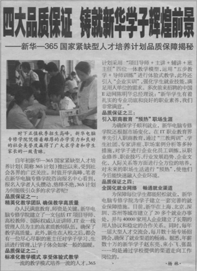 9月13日,《合肥晚報》報道:“四大品質保證 鑄就新華學子輝煌前景——新華-365國家緊缺型人才培養計劃品質保障揭秘”,敬請關注!
