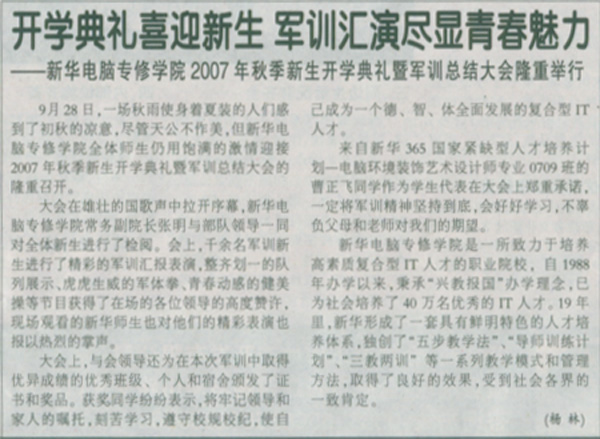10月9日,《安徽商報(bào)》報(bào)道:“開學(xué)典禮喜迎新生 軍訓(xùn)匯演盡顯青春魅力——新華電腦專修學(xué)院207年秋季新生開學(xué)典禮暨軍訓(xùn)總結(jié)大會(huì)隆重舉行”,敬請(qǐng)關(guān)注!