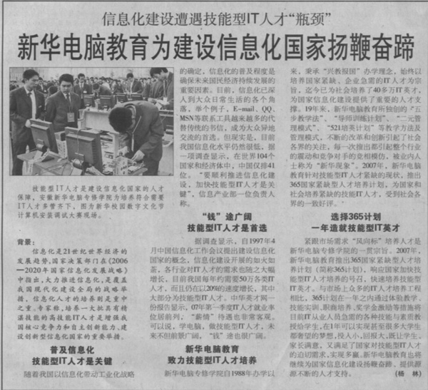 9月25日,《中國青年報》報道:“信息化建設遭遇技能型IT人才‘瓶頸’——新華電腦教育為建設信息化國家揚鞭奮蹄”!