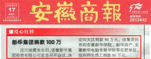 時,由集團投資的安徽新華學院、新華房產、安徽新華電腦專修學院等在肥單位,主動組織師生員工向地震災