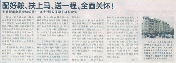 | 8月21日,《安徽商報(bào)》報(bào)道:“配好鞍、扶上馬、送一程、全面關(guān)懷!——安徽新華電腦專修學(xué)院‘一條龍’服務(wù)保學(xué)子輕松就業(yè)”,敬請(qǐng)關(guān)注! |
