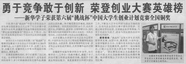 10月22日,《合肥晚報》報道:“勇于競爭敢于創新 榮登創業大賽英雄榜——新華學子榮獲第六屆‘挑戰杯’中國大學生創業計劃競賽全國銅獎”,敬請關注!