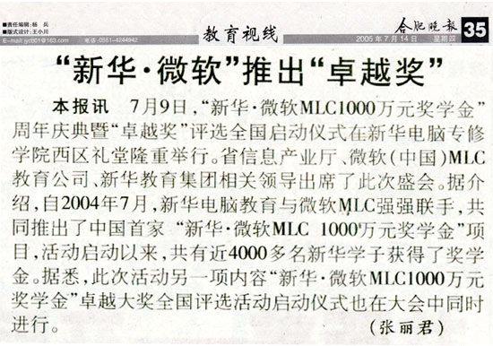 7月14日,《合肥晚報》“教育視線”版報道新華微軟推出“卓越獎”,并做了詳細介紹,敬請關注!