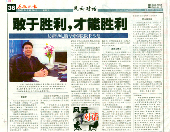 8月24日,《合肥晚報》記者采訪了新華電腦專修學院院長沙旭,沙旭院長就“英雄夢”、“成功與情商”、“職業教育談”三個方面暢談了對人生的感悟與認識,以及對電腦職業教育的現狀分析和今后的發展趨勢。8月26日,《合肥晚報》“風云對話”版對此做了全面的報道!
